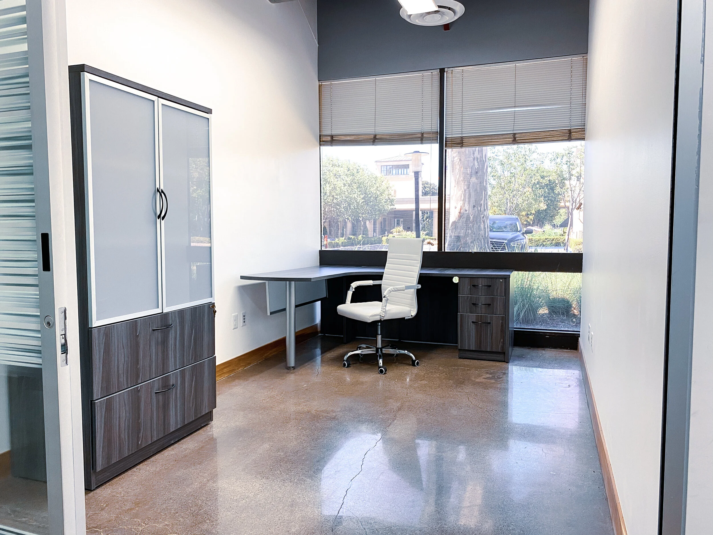 Empty office with a white desk, white office chair, black filing cabinet, and large windows with blinds, in a bright area with a polished concrete floor.